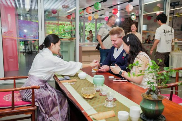 品茶区,伴随着观看茶艺老师的制作,外籍教师Scott兴奋的品尝各种茶后积极互动,与茶艺老师交流品茶心得,并能使用简单的中文进行沟通,在场的工作人员连连称赞,说:“Scott老师就像个中国通!”