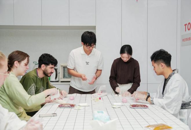 冰皮月饼制作区实行“小班教学”。考虑到大家都是第一次制作月饼,钱弈淳老师根据“揉—包—压—脱”的中文口诀,现场用英语重复“knead—wrap—press—remove”,并手把手示范倒模技巧;在他和工作人员的指导下,大家很快就掌握了制作技巧,一个个精美的冰皮月饼在他们的手中诞生。