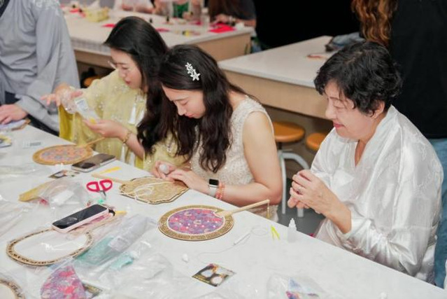 珠扇制作区,李甜甜老师利用视频图解,现场示范如何制作精美珠扇的步骤,再用英语提示,赵诗佳协助外籍学员粘贴珠花,五分钟完成扇面装饰。
