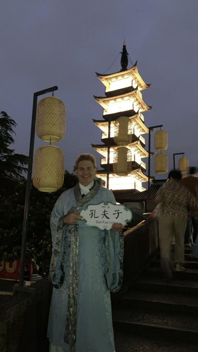 在“地标打卡”任务中,外籍教师们在德富桥、登龙桥与法华塔前留下合影,感受嘉定古老建筑与江南文化的独特韵味;“寻友任务”促使他们主动与上海本地市民交流合影,拉近了彼此距离;“我画你猜”环节则以漫画形式演绎《论语》成语,在欢笑中传播经典智慧;“一句话挑战”中,外籍教师们用中文诵出“己所不欲,勿施于人”等名句,发音虽显生涩却诚意十足;最后的“孔子说·变装”任务则通过“现代困惑”到“古代顿悟”的形象转变,以生动有趣的方式体现出孔子思想的当代启示。