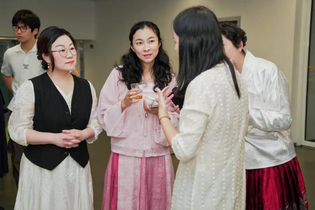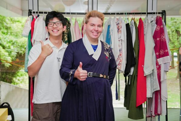 汉服体验区里,中外教师分工协作:钱弈淳讲解唐制襦裙的飘逸特点,Scott即时查询手机补充历史背景;钱弈淳、李甜甜两位老师协助在场外籍嘉宾试穿各式汉服,短短半小时,30余位外籍嘉宾完成换装打卡。当北亚利桑那大学集中授课教师陈茜穿上汉服,摇身一变成为“唐朝少女”时,Alisa Ashley老师兴奋地鼓掌说:“太美了,你现在就是中华传统文化的代言人!”