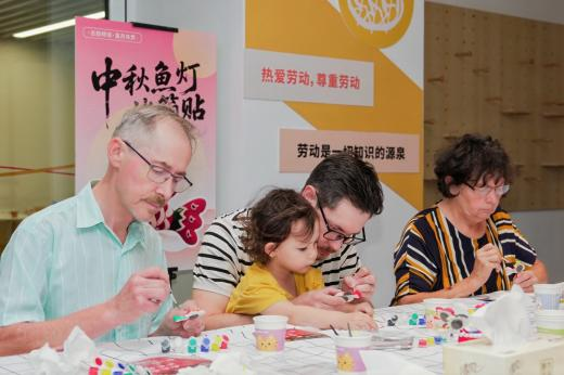 在中秋鱼灯冰箱贴制作和拓印福字风铃区,外教老师们也积极参与,他们被这些充满中国传统韵味的制作活动深深吸引,眼神中透露出好奇与兴奋。一位外教老师感慨地说:“这样的活动太有意义了,它让我们更加贴近中国,也让我们对中国文化有了更深层次的认知和尊重。我们会把这些美好的经历和作品带回自己的国家,向更多的人讲述中国故事。”