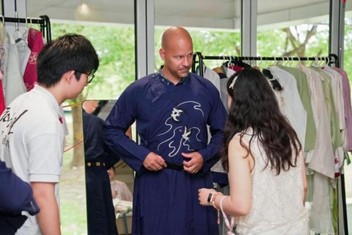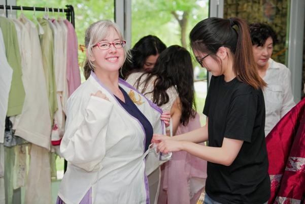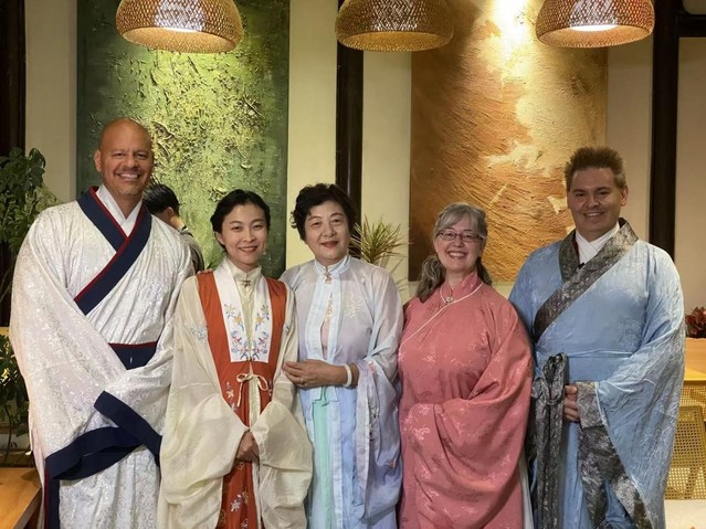 汉服体验区里,中外教师分工协作:钱弈淳讲解唐制襦裙的飘逸特点,Scott即时查询手机补充历史背景;钱弈淳、李甜甜两位老师协助在场外籍嘉宾试穿各式汉服,短短半小时,30余位外籍嘉宾完成换装打卡。当北亚利桑那大学集中授课教师陈茜穿上汉服,摇身一变成为“唐朝少女”时,Alisa Ashley老师兴奋地鼓掌说:“太美了,你现在就是中华传统文化的代言人!”