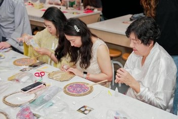 珠扇制作区,李甜甜老师利用视频图解,现场示范如何制作精美珠扇的步骤,再用英语提示,赵诗佳协助外籍学员粘贴珠花,五分钟完成扇面装饰。